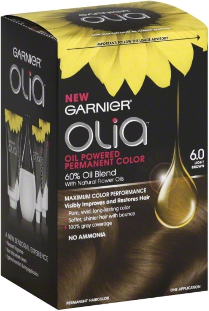 Garnier Olia hair dye shade 6.0, “Light Brown,” is a natural, light brown shade that will allow your true tones to show. It also provides 100% gray coverage.